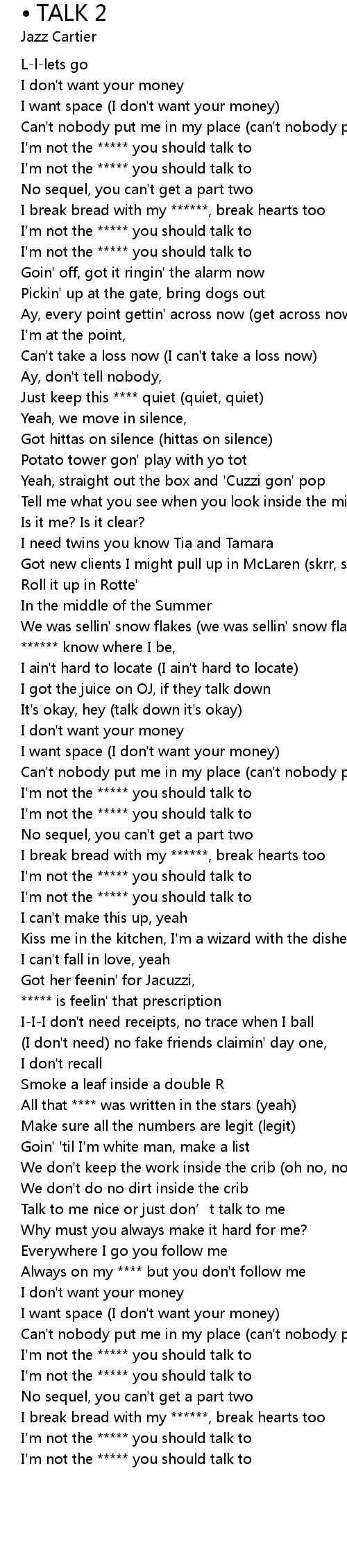 | [02:18.87] | Always on my **** but you don't follow me |