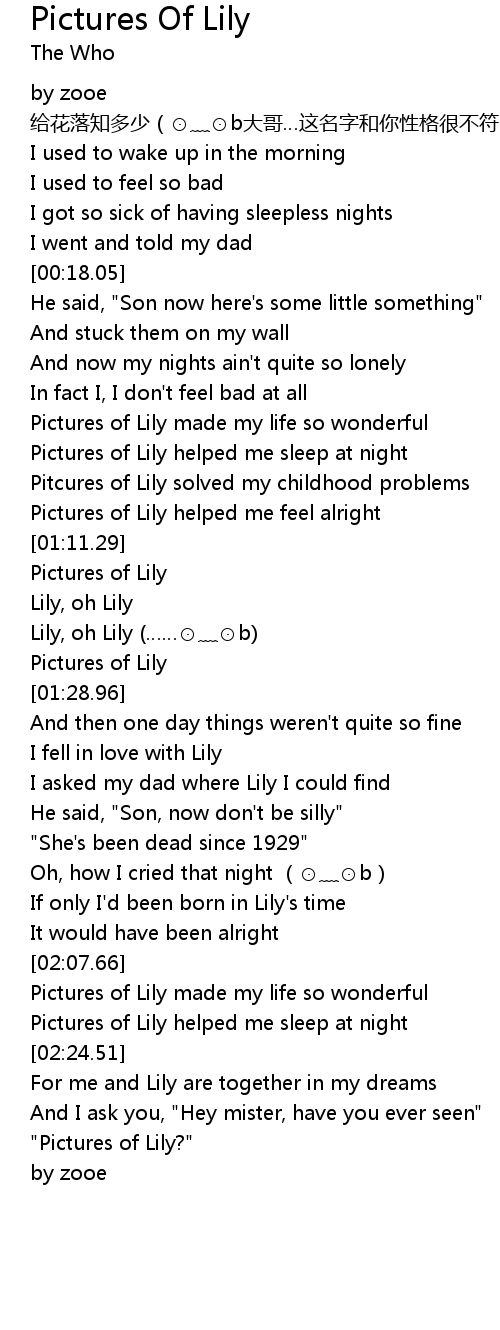 | [00:38.79] | Pictures of Lily made my life so wonderful |