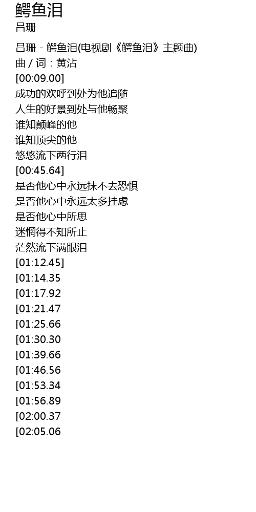 | [00:03.00] | 吕珊 - 鳄鱼泪(电视剧《鳄鱼泪》主题曲) |