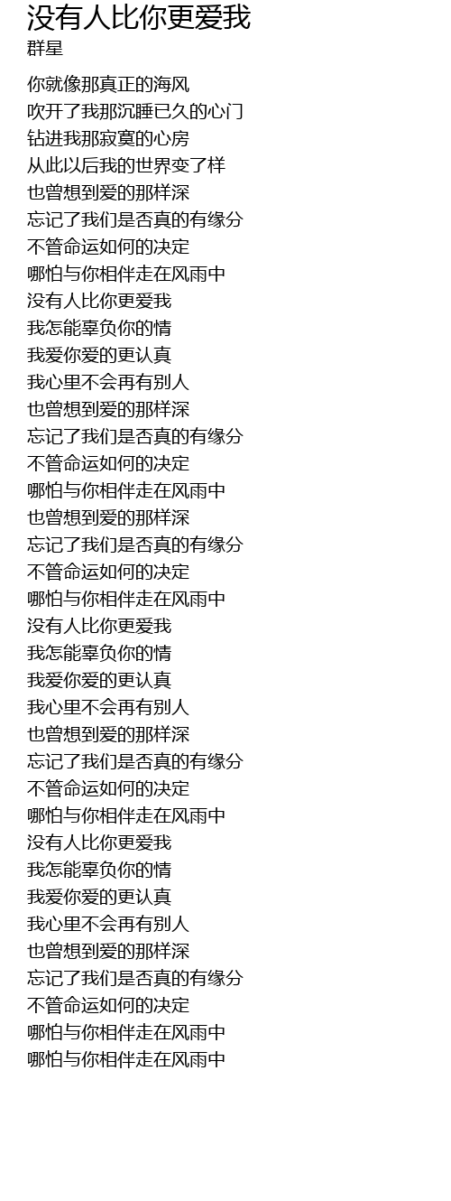 | [03:15.87] | méi yǒu rén bǐ nǐ gèng ài wǒ |