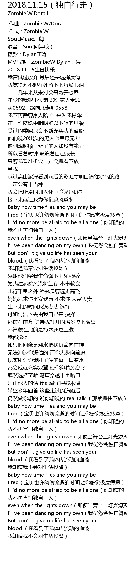 | [03:06.373] | I' ve been dancing on my own wo reng ran hui du zi wu dong |