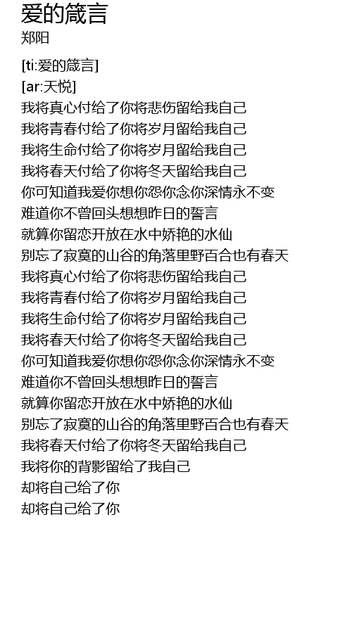 | [00:16.263] | wo jiang zhen xin fu gei le ni jiang bei shang liu gei wo zi ji |