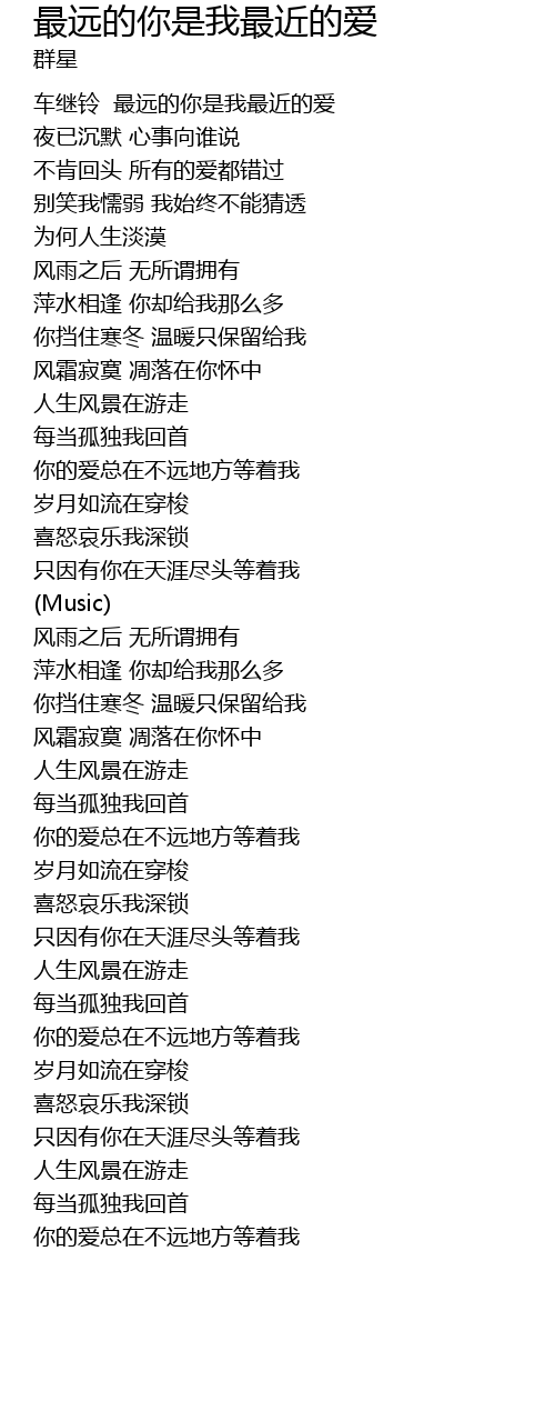 | [00:05.00] | 车继铃 最远的你是我最近的爱 |