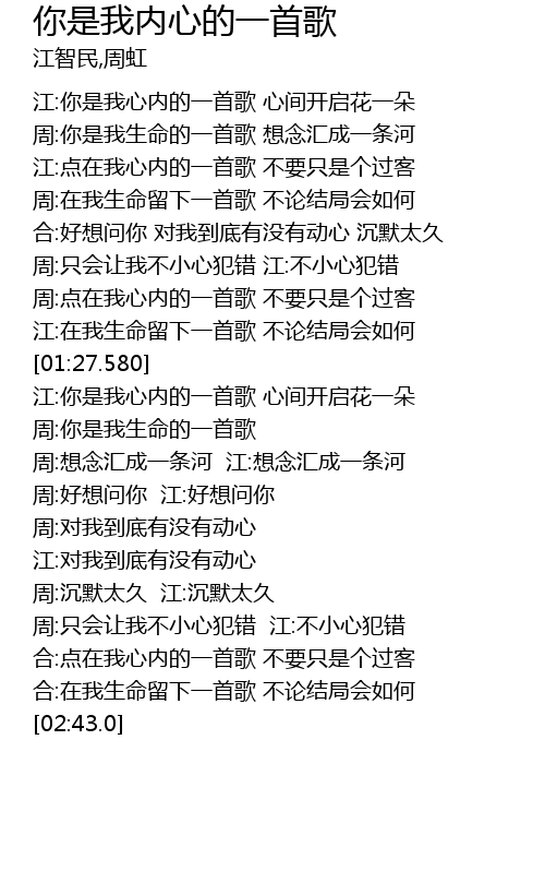 | [00:10.720] | 江:你是我心内的一首歌 心间开启花一朵 |