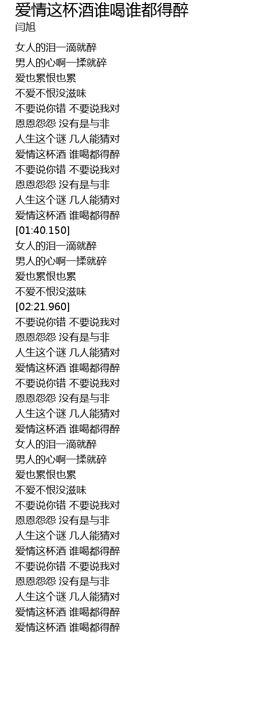| [02:44.430] | 爱情这杯酒 谁喝都得醉 |