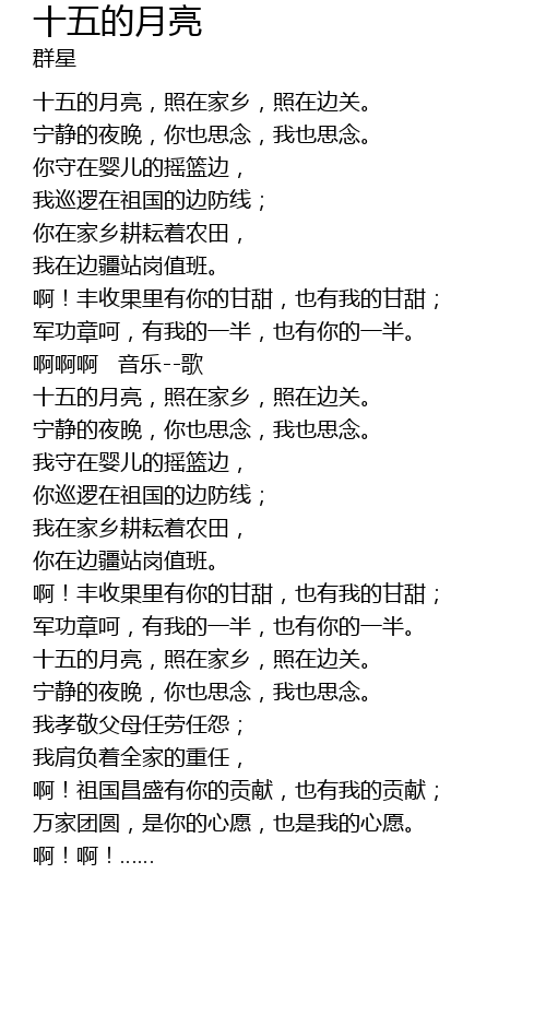 | [00:34.02] | 十五的月亮,照在家乡,照在边关。 |