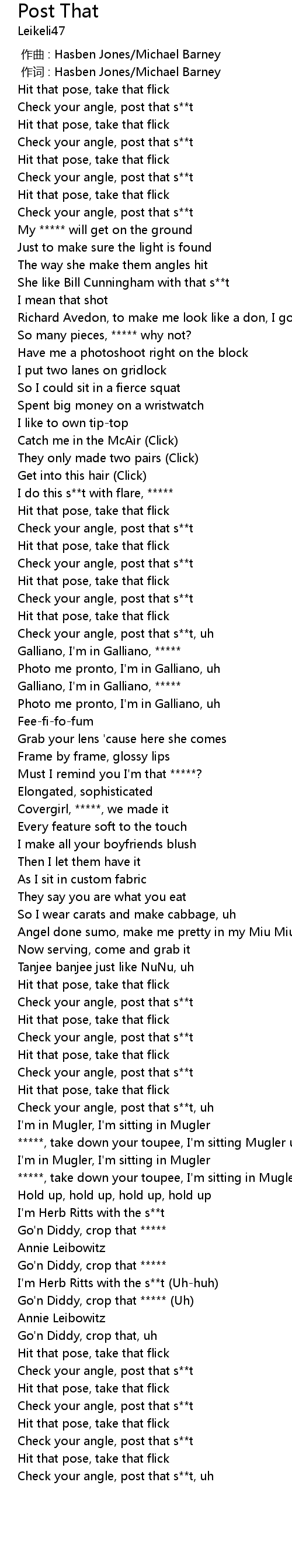| [01:08.95] | Check your angle, post that s**t, uh |
