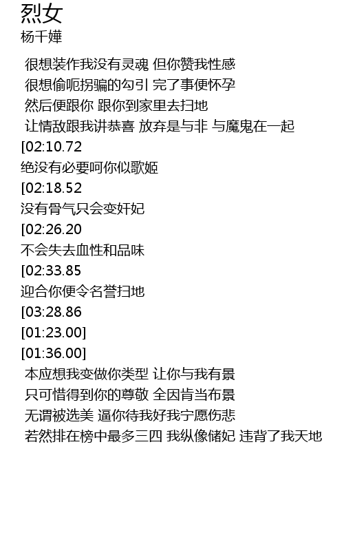 | [00:53.27][02:10.72][02:57.19] | 烈女不怕死 但凭傲气 绝没有必要呵你似歌姬 |