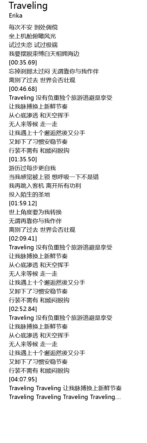 | [04:09.05] | Traveling Traveling 让我脉搏换上新鲜节奏 |