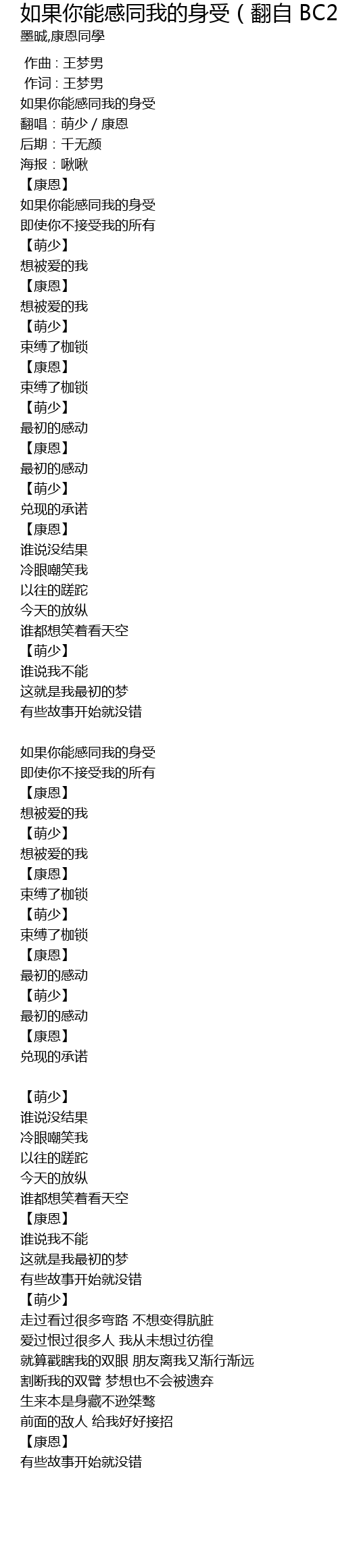 | [00:01.263] | rú guǒ nǐ néng gǎn tóng wǒ de shēn shòu |