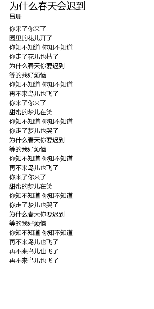 | [00:46.50] | wèi shí me chūn tiān nǐ yào chí dào |