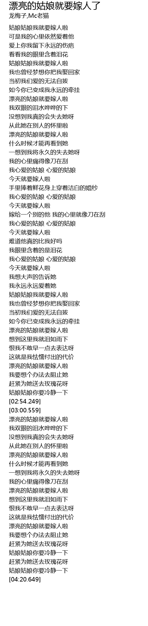 | [02:01.760] | 姑娘姑娘我就要嫁人啦 |