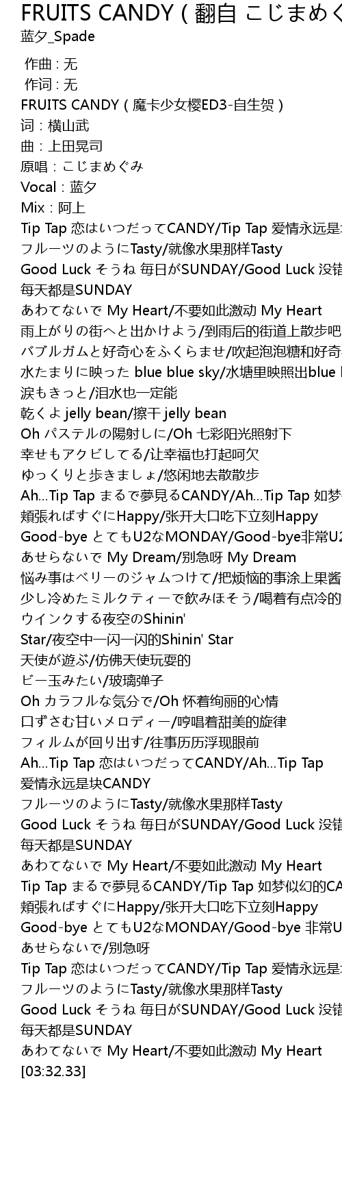 | [00:00.43] | FRUITS CANDY(魔卡少女樱ED3-自生贺) |