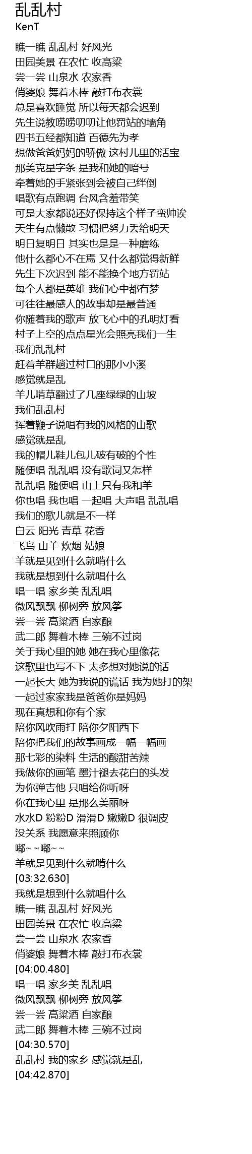 | [04:36.0] | 乱乱村 我的家乡 感觉就是乱 |