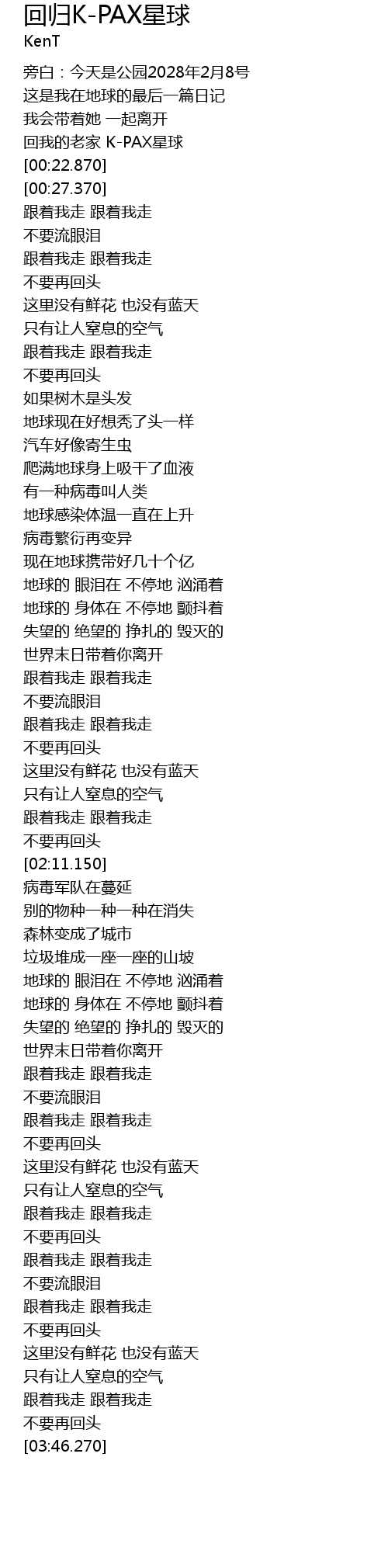 | [00:18.840] | 回我的老家 K-PAX星球 |