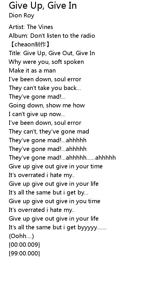 | [00:01.11] | Title: Give Up, Give Out, Give In |