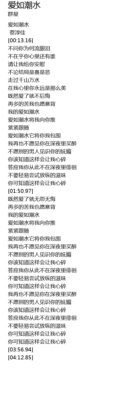 | [01:04.08] | wǒ de ài rú cháo shuǐ |