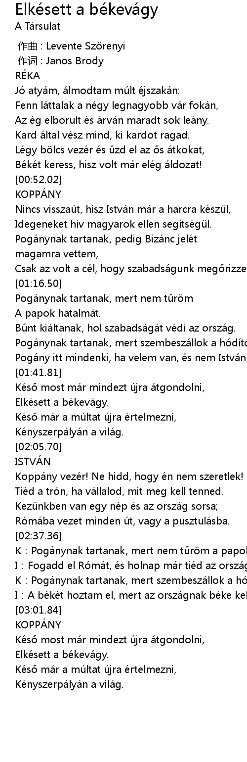 | [00:44.72] | Békét keress, hisz volt már elég áldozat! |