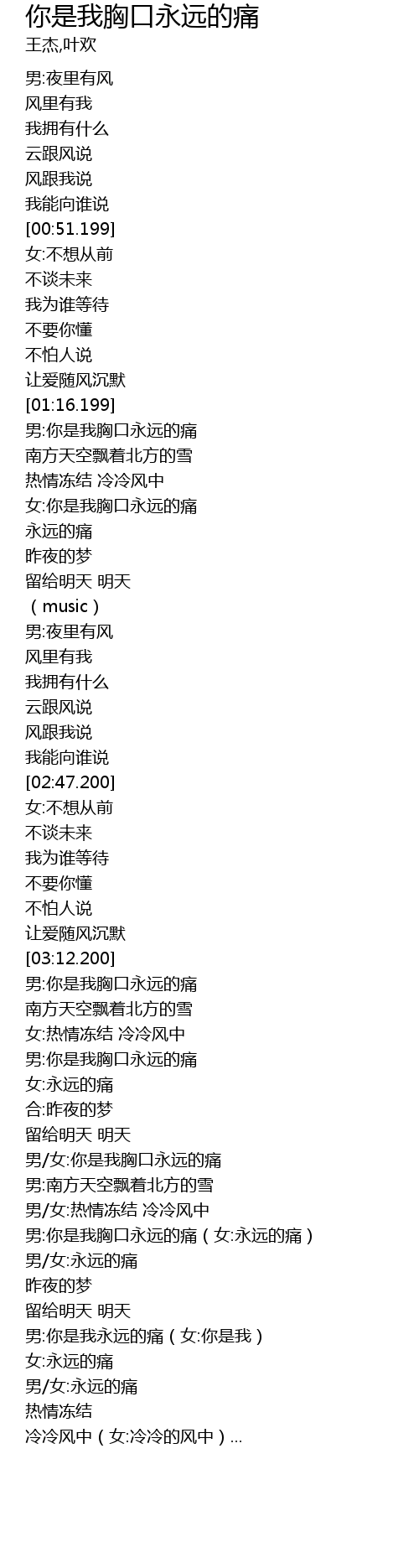 | [04:13.200] | nan: ni shi wo xiong kou yong yuan de tong nv: yong yuan de tong |