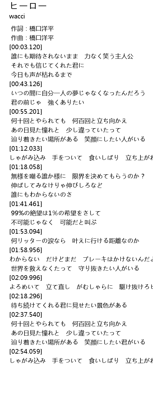 | [02:54.059] | しゃがみ込み 手をついて 食いしばり 立ち上がれヒーロー |