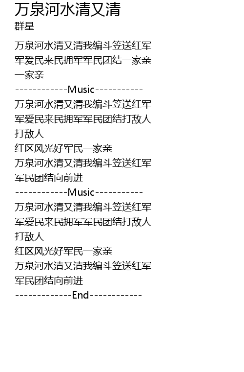 | [01:16.970] | 万泉河水清又清我编斗笠送红军 |