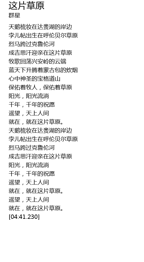| [00:39.779] | 天鹅梳妆在达赉湖的岸边 |
