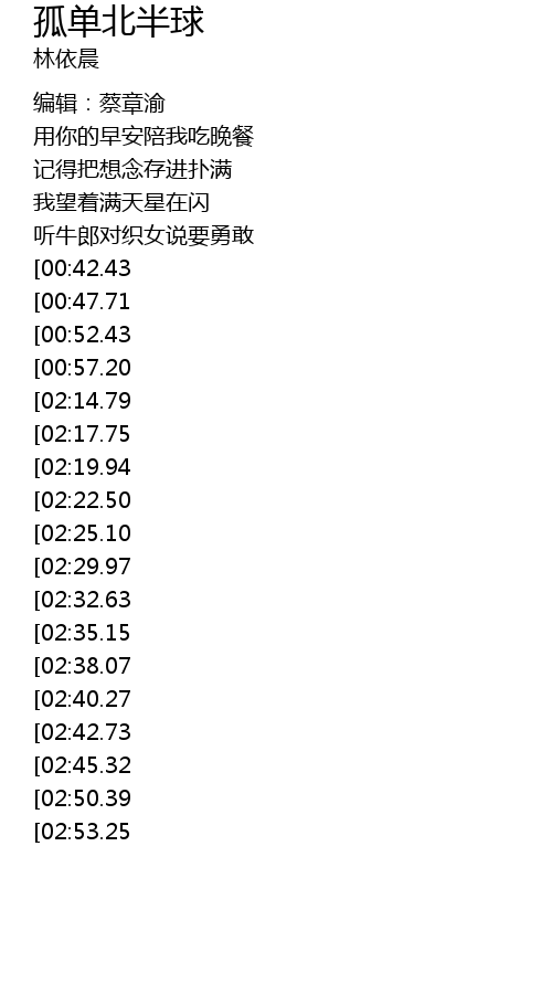 | [03:44.13][02:42.73][01:29.87] | 我北半球的孤单 |