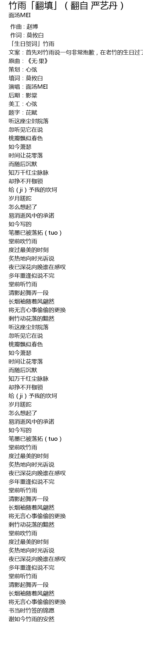 | [00:01.58] | 文案:首先对竹雨说一句非常抱歉,在老竹的生日过了许久才开始动笔,呱唧呱唧,不嫌弃我写的就好了,不商用。 |