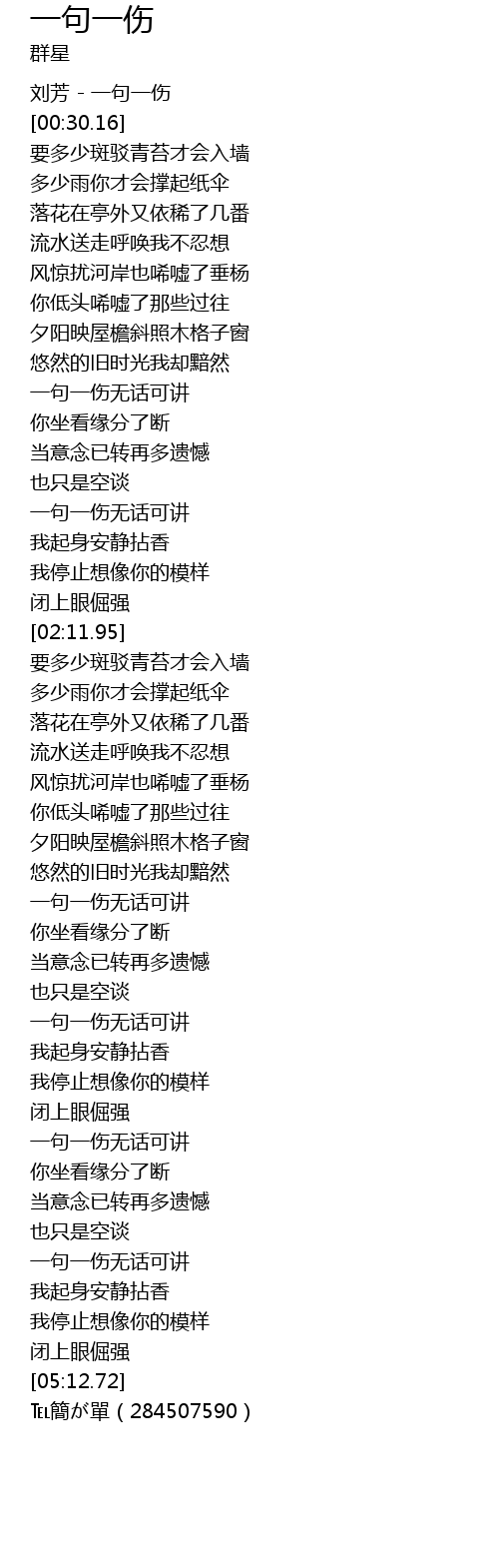| [00:00.00] | 刘芳 - 一句一伤 |