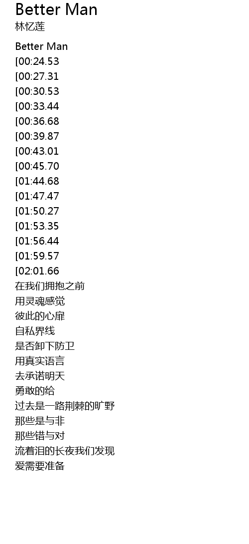 | [03:16.43][02:01.66][01:07.26] | to be a better man |