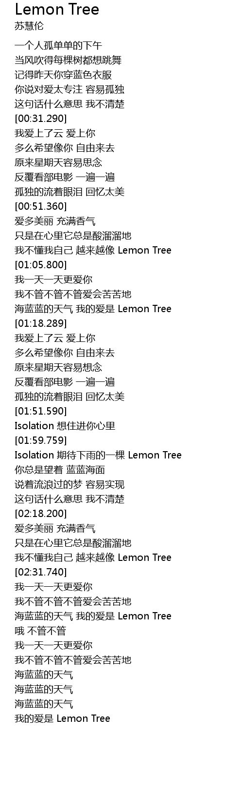 | [02:00.570] | Isolation qi dai xia yu de yi ke Lemon Tree |