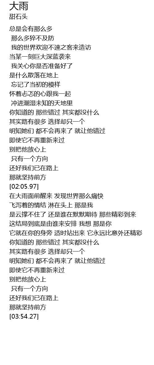 | [02:18.59] | 在大雨面前醒来 发现世界那么痛快 |