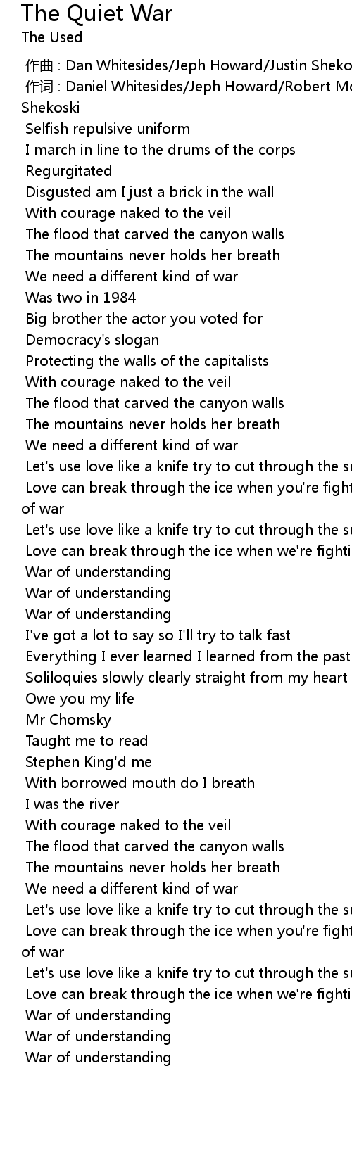 | [02:00.927] | Love can break through the ice when we' re fighting a different war |