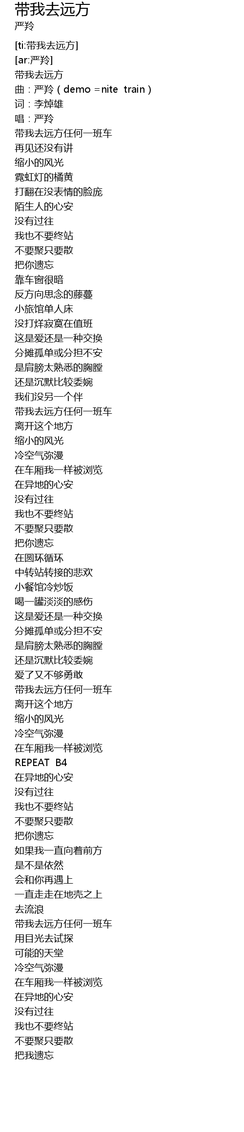 | [00:01.694] | dài wǒ qù yuǎn fāng rèn hé yī bān chē |