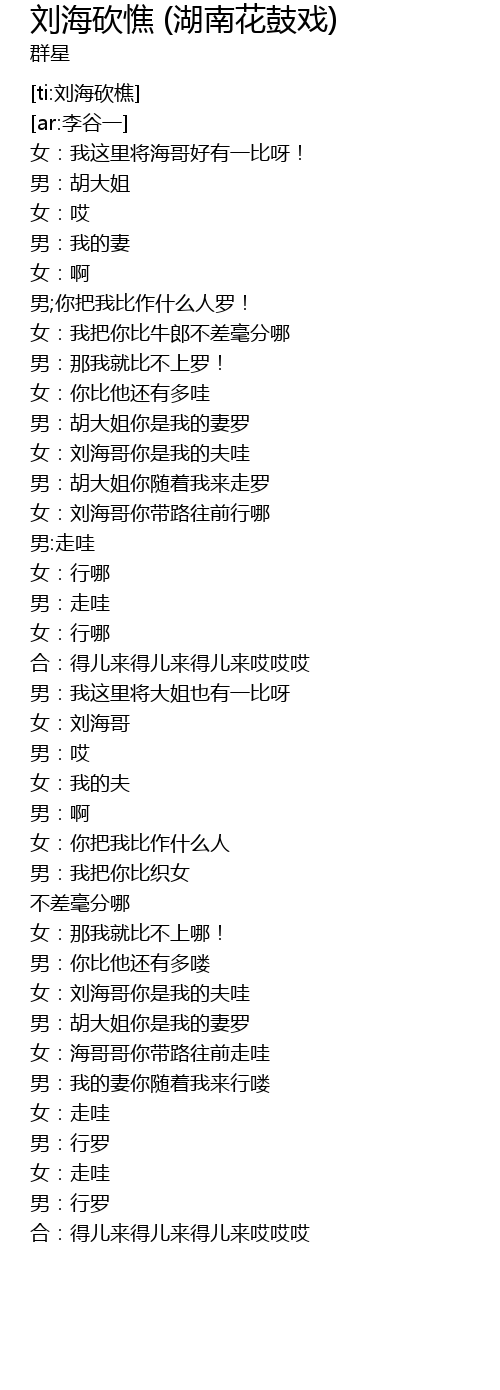 | [01:18.324] | 女:刘海哥你带路往前行哪 |