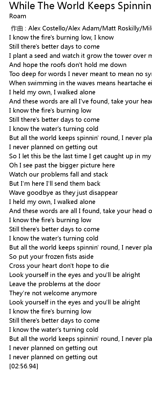 | [02:35.97] | But all the world keeps spinnin' round, I never planned on getting out |