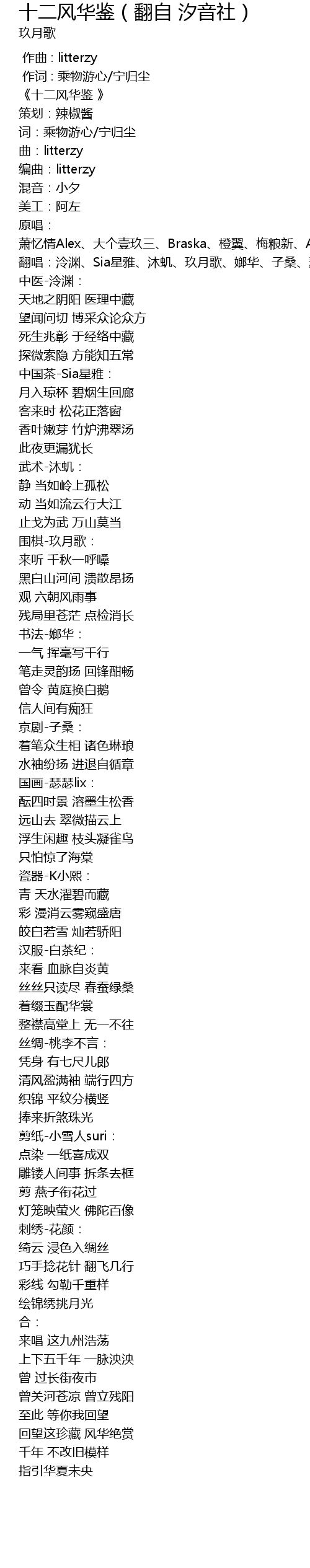 | [00:10.943] | 翻唱:泠渊、Sia星雅、沐虮、玖月歌、嫏华、子桑、瑟瑟lix、K小熙、白茶纪、桃李不言、小雪人suri、花颜、 |