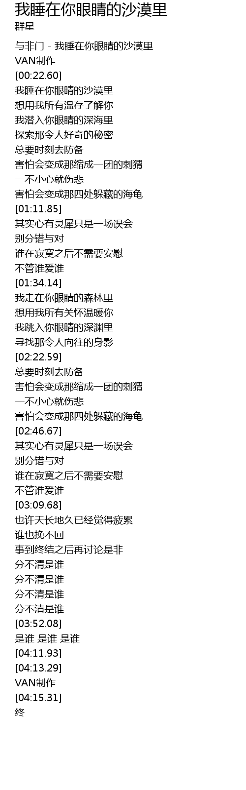 | [00:00.00] | yǔ fēi mén wǒ shuì zài nǐ yǎn jīng de shā mò lǐ |