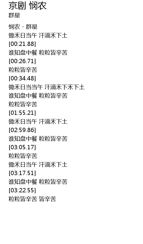 | [01:34.22] | 谁知盘中餐 粒粒皆辛苦 |