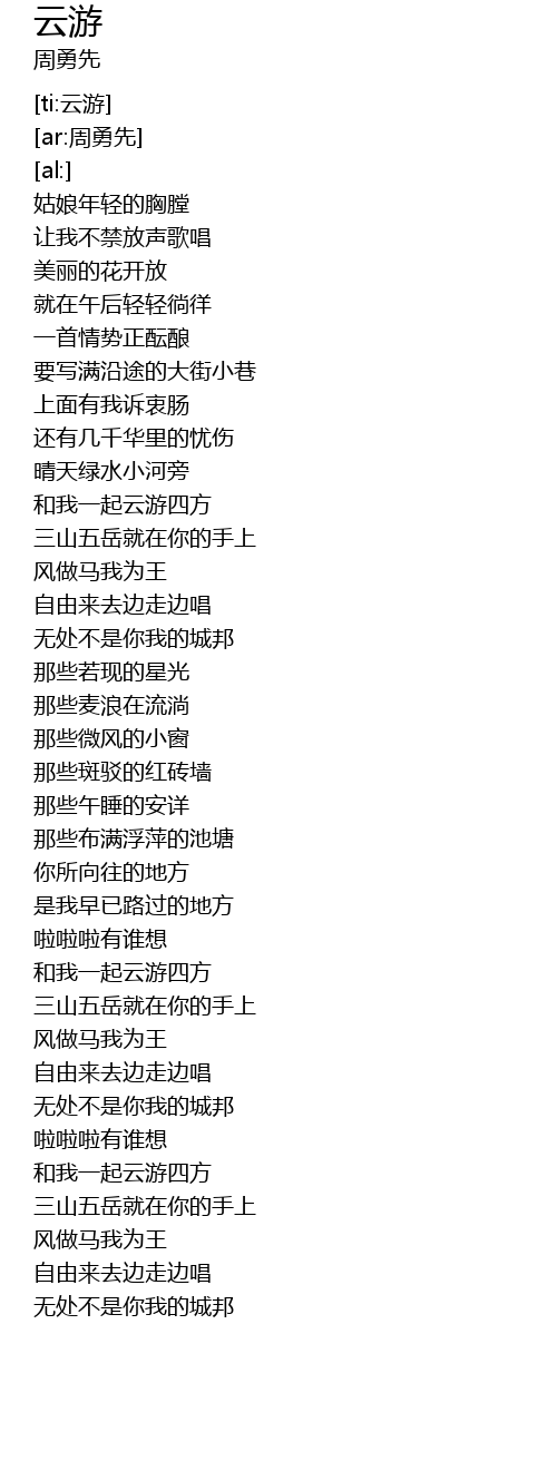 | [00:41.67] | hé wǒ yì qǐ yún yóu sì fāng |