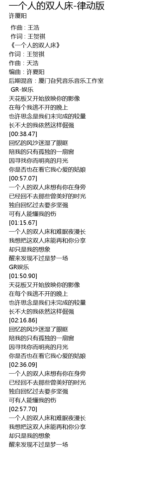 | [01:01.38] | yí ge rén de shuāng rén chuáng xiǎng yǒu nǐ zài shēn páng |