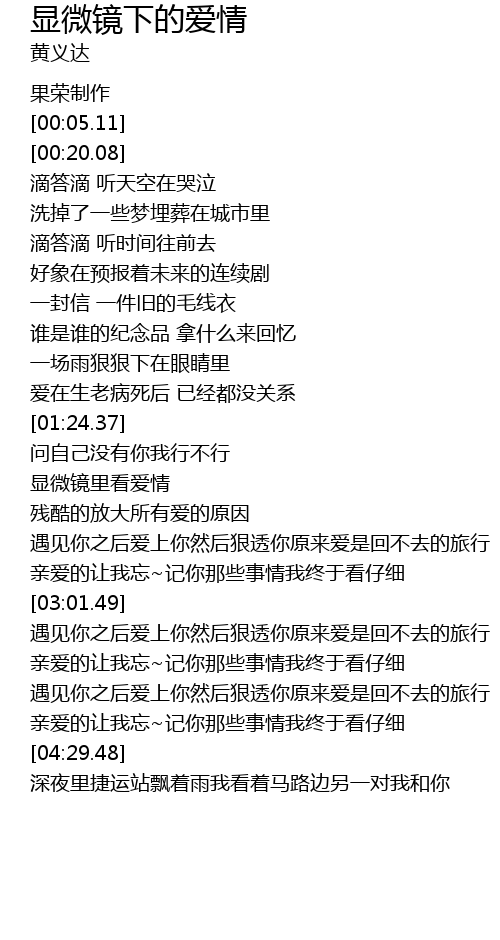 | [04:32.62] | 深夜里捷运站飘着雨我看着马路边另一对我和你 |