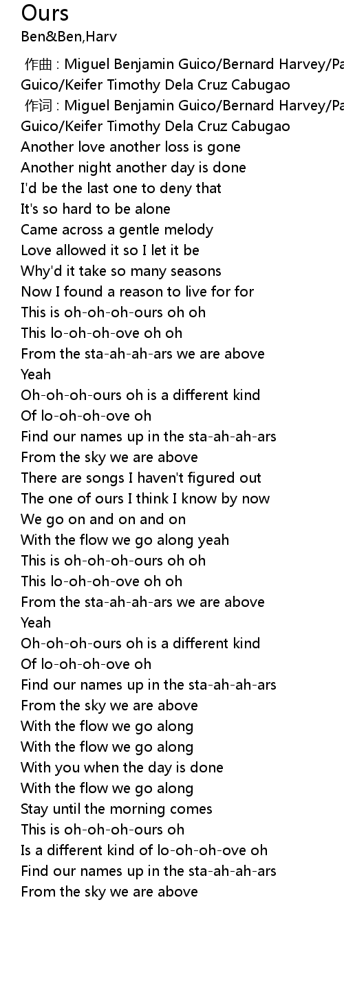 | [00:01.000] | 作词 : Miguel Benjamin Guico/Bernard Harvey/Paolo Benjamin Guico/Keifer Timothy Dela Cruz Cabugao |