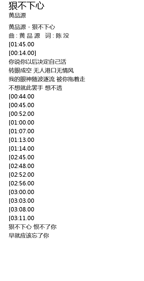 | [00:00.00] | 黄品源 - 狠不下心 |