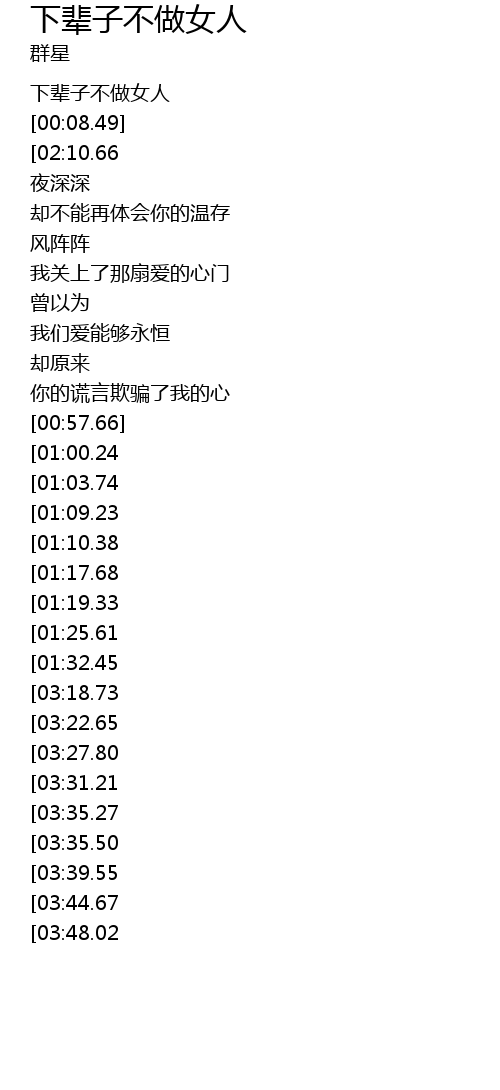 | [04:23.62][03:48.02][02:03.08] | 我祈求下辈子不做女人 |