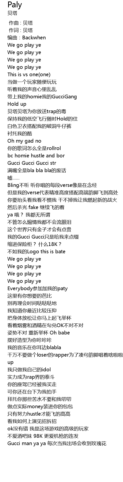| [02:19.75] | Gucci man ya ya 每次当我出场会收到玫瑰花 |