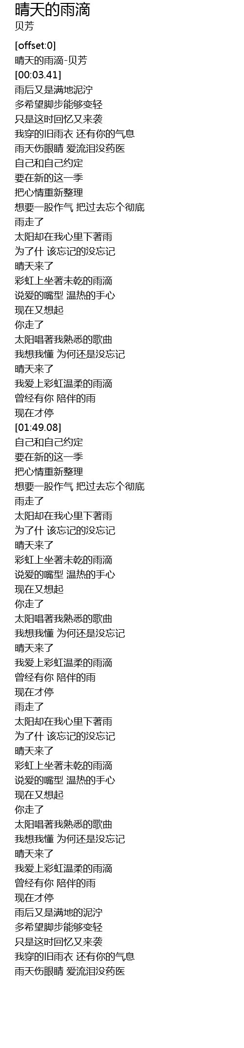 | [00:00.72] | 晴天的雨滴-贝芳 |