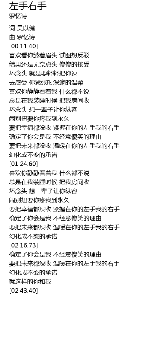 | [01:54.17] | 要把幸福都没收 紧握在你的左手我的右手 |