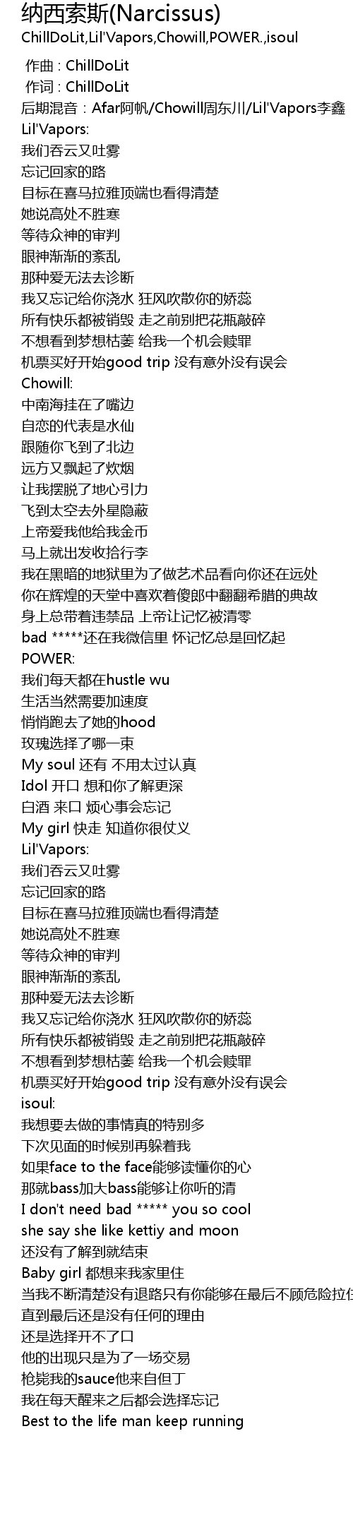 | [00:07.586] | 后期混音:Afar阿帆/Chowill周东川/Lil'Vapors李鑫 |