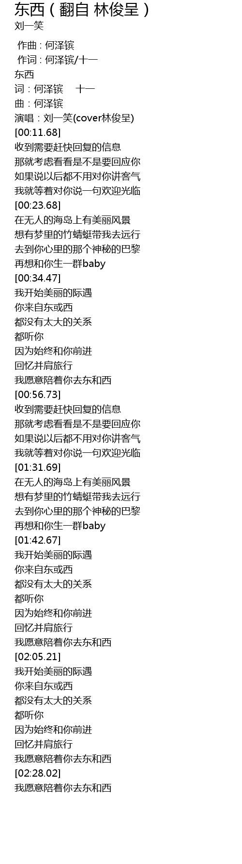 | [02:00.65] | 我愿意陪着你去东和西 |